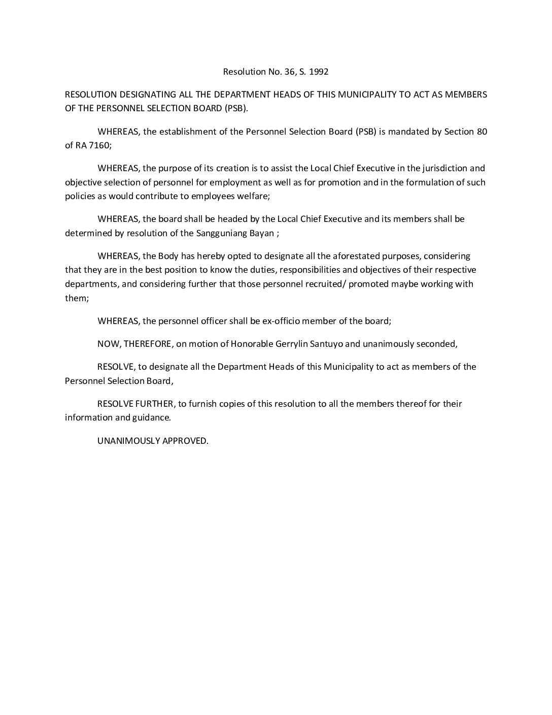 Resolution No. 92-036