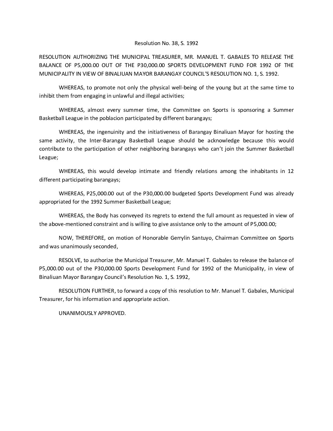 Resolution No. 92-038
