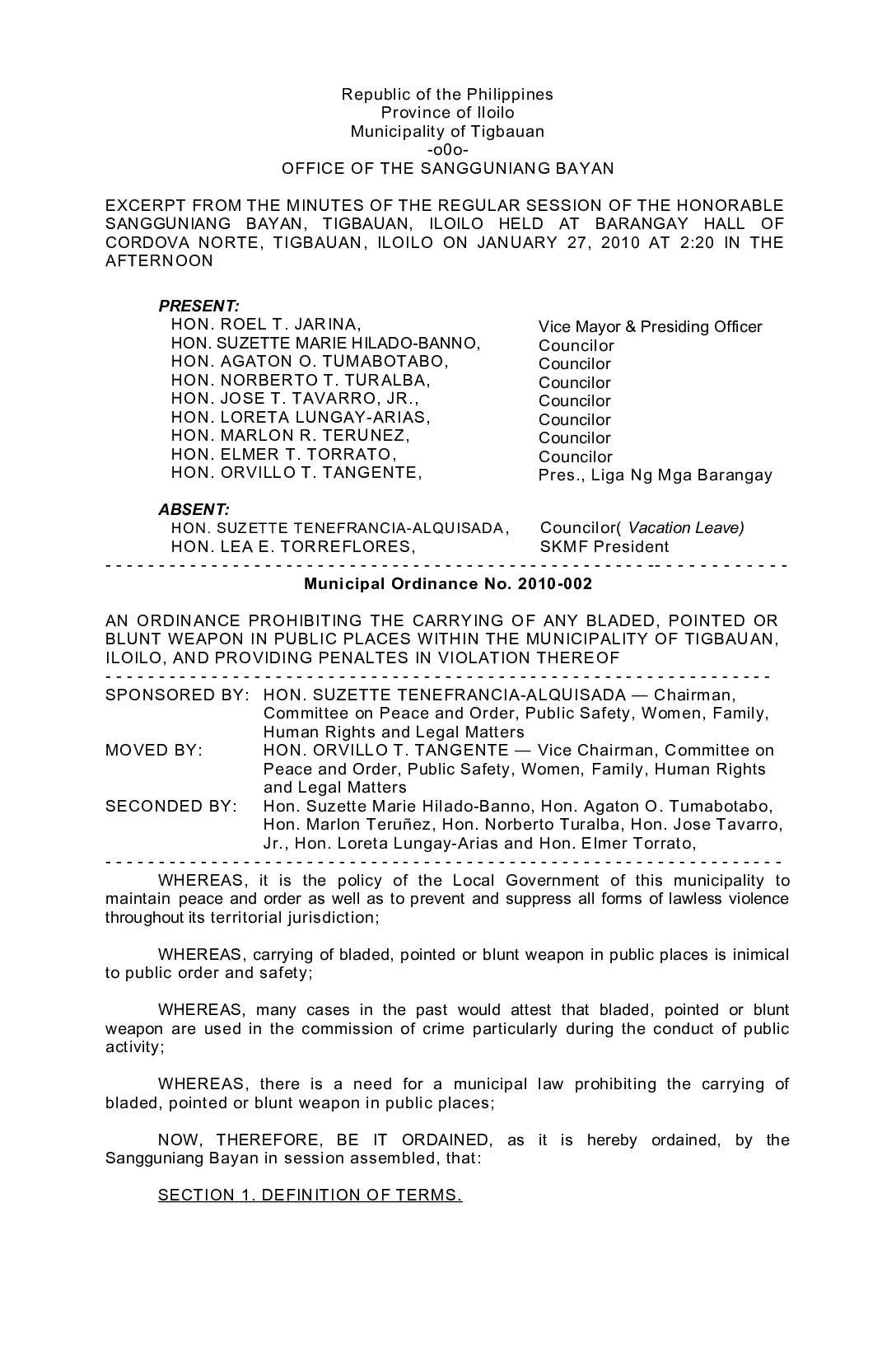 Municipal Ordinance No. 2010-002