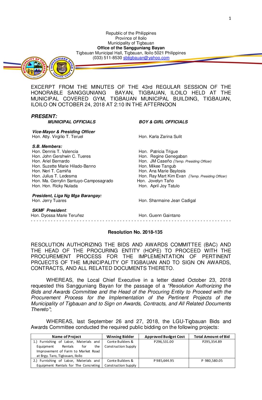October 24, 2018 Comment off Resolution No. 2018-135 – RESOLUTION AUTHORIZING THE BIDS AND AWARDS COMMITTEE (BAC) AND THE HEAD OF THE PROCURING ENTITY (HOPE) TO PROCEED WITH THE PROCUREMENT PROCESS FOR THE IMPLEMENTATION OF PERTINENT PROJECTS OF THE MUNICIPALITY OF TIGBAUAN AND TO SIGN ON AWARDS, CONTRACTS, AND ALL RELATED DOCUMENTS THERETO. Read more