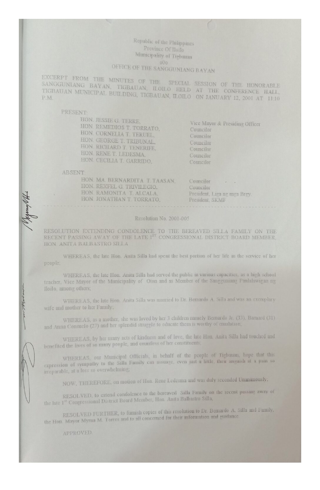 Resolution No. 2001-005
