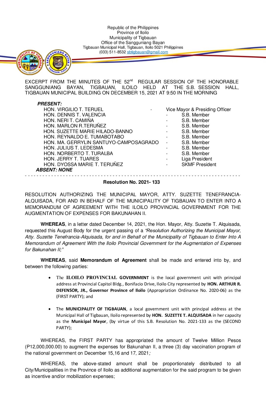 Resolution No. 2022-053 – RESOLUTION AUTHORIZING THE MUNICIPAL MAYOR, ATTY. SUZETTE T. ALQUISADA, FOR AND IN BEHALF OF THE MUNICIPALITY OF TIGBAUAN TO ENTER INTO A MEMORANDUM OF AGREEMENT (MOA) WITH THE DEPARTMENT OF SOCIAL WELFARE AND DEVELOPMENT (DSWD) FOR THE IMPLEMENTATION OF SUPPLEMENTARY FEEDING PROGRAM IN THE MUNICIPALITY OF TIGBAUAN