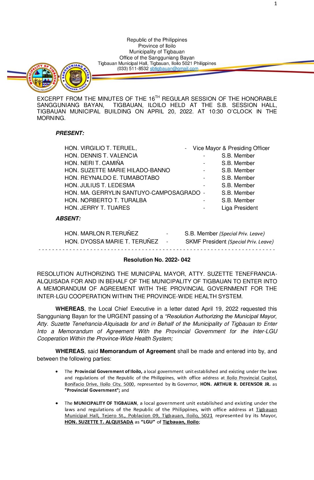 Resolution No. 2022-042 – RESOLUTION AUTHORIZING THE MUNICIPAL MAYOR, ATTY. SUZETTE TENEFRANCIAALQUISADA FOR AND IN BEHALF OF THE MUNICIPALITY OF TIGBAUAN TO ENTER INTO A MEMORANDUM OF AGREEMENT WITH THE PROVINCIAL GOVERNMENT FOR THE INTER-LGU COOPERATION WITHIN THE PROVINCE-WIDE HEALTH SYSTEM