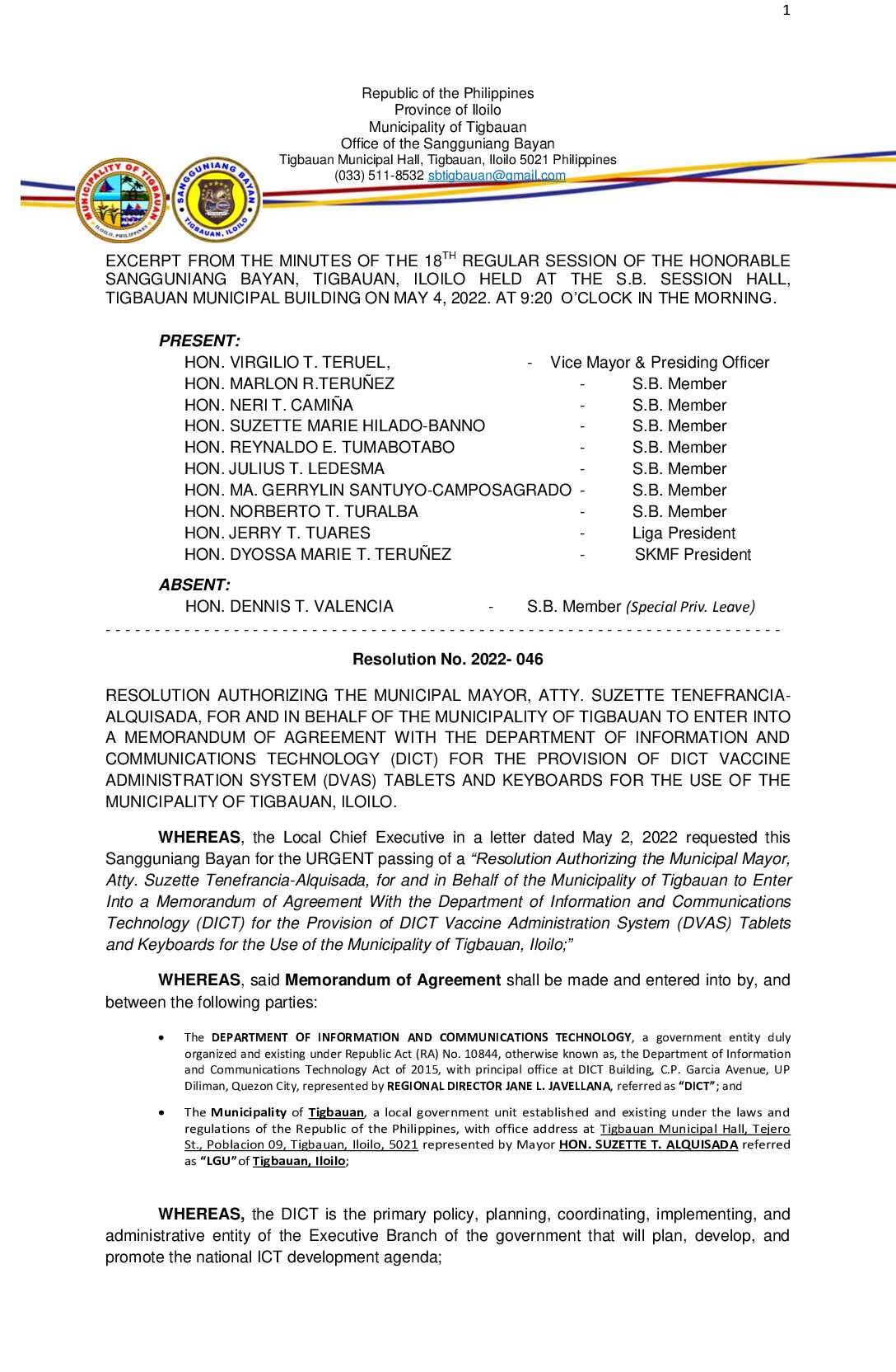 Resolution No. 2022-046 – RESOLUTION AUTHORIZING THE MUNICIPAL MAYOR, ATTY. SUZETTE TENEFRANCIAALQUISADA, FOR AND IN BEHALF OF THE MUNICIPALITY OF TIGBAUAN TO ENTER INTO A MEMORANDUM OF AGREEMENT WITH THE DEPARTMENT OF INFORMATION AND COMMUNICATIONS TECHNOLOGY (DICT) FOR THE PROVISION OF DICT VACCINE ADMINISTRATION SYSTEM (DVAS) TABLETS AND KEYBOARDS FOR THE USE OF THE MUNICIPALITY OF TIGBAUAN, ILOILO.