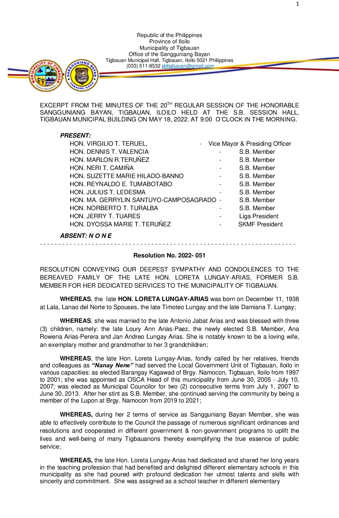 Resolution No. 2022-051 – RESOLUTION CONVEYING OUR DEEPEST SYMPATHY AND CONDOLENCES TO THE BEREAVED FAMILY OF THE LATE HON. LORETA LUNGAY-ARIAS, FORMER S.B. MEMBER FOR HER DEDICATED SERVICES TO THE MUNICIPALITY OF TIGBAUAN.