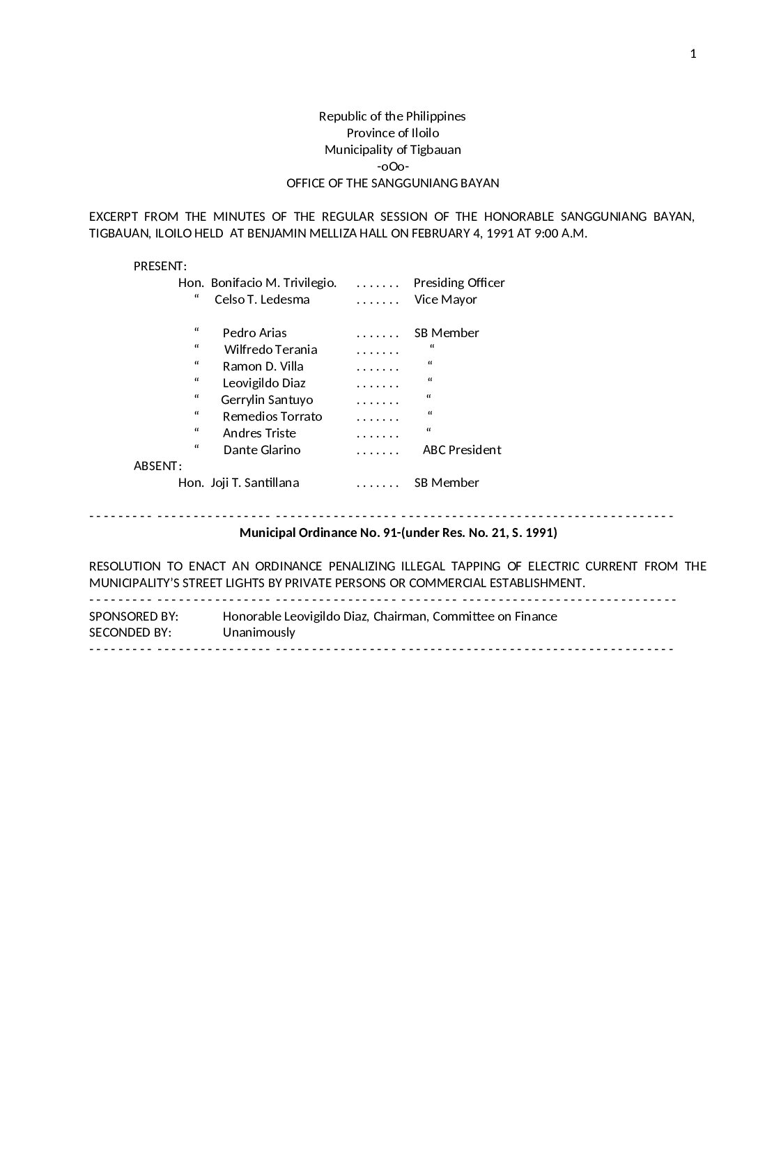 Municipal Ordinance No. 1991-001