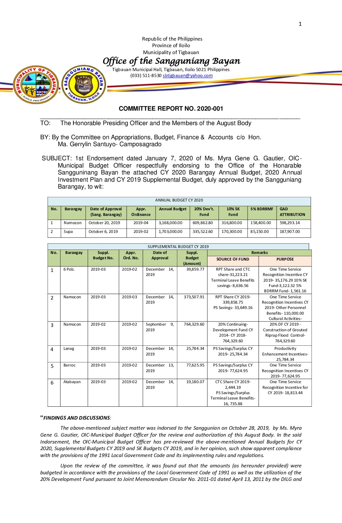 COMMITTEE REPORT NO. 2020-001