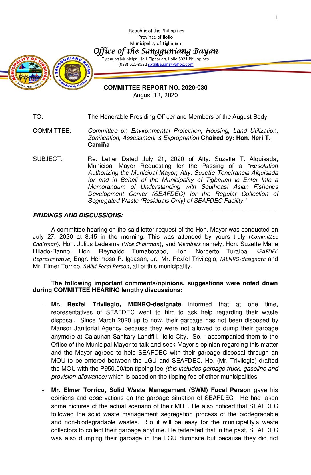 COMMITTEE REPORT NO. 2020-036