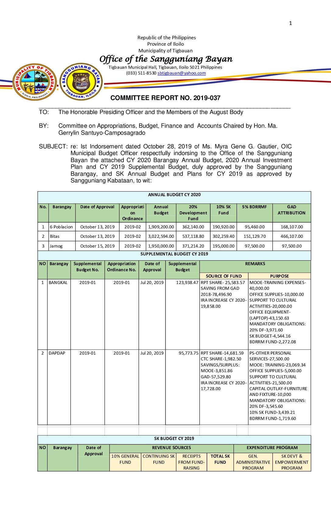 COMMITTEE REPORT NO. 2019-037