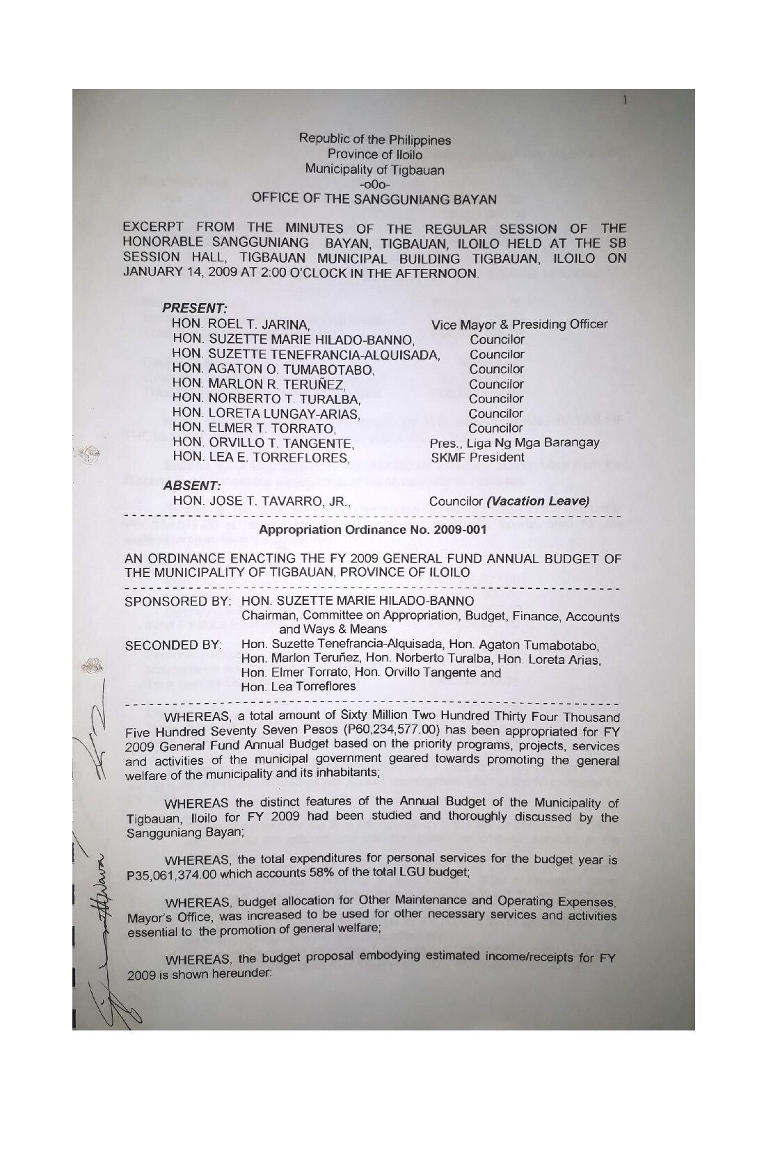Appropriation Ordinance No. 2009-001