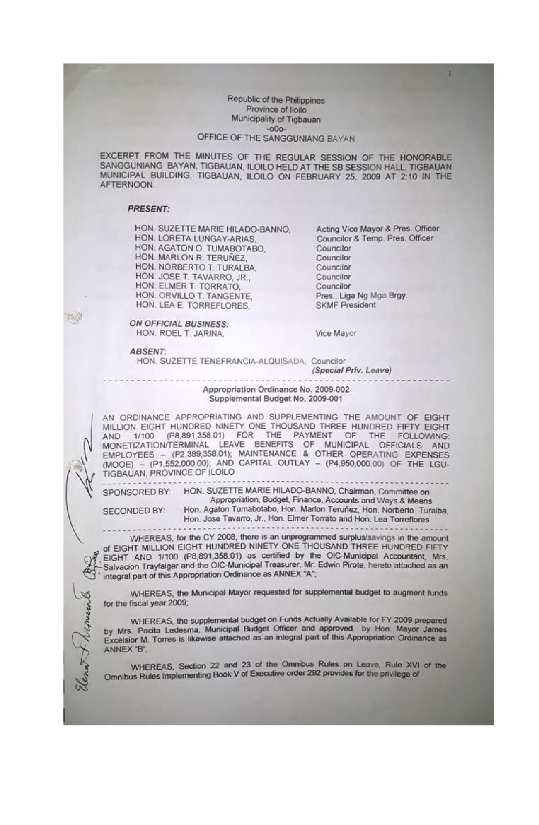 Appropriation Ordinance No. 2009-002