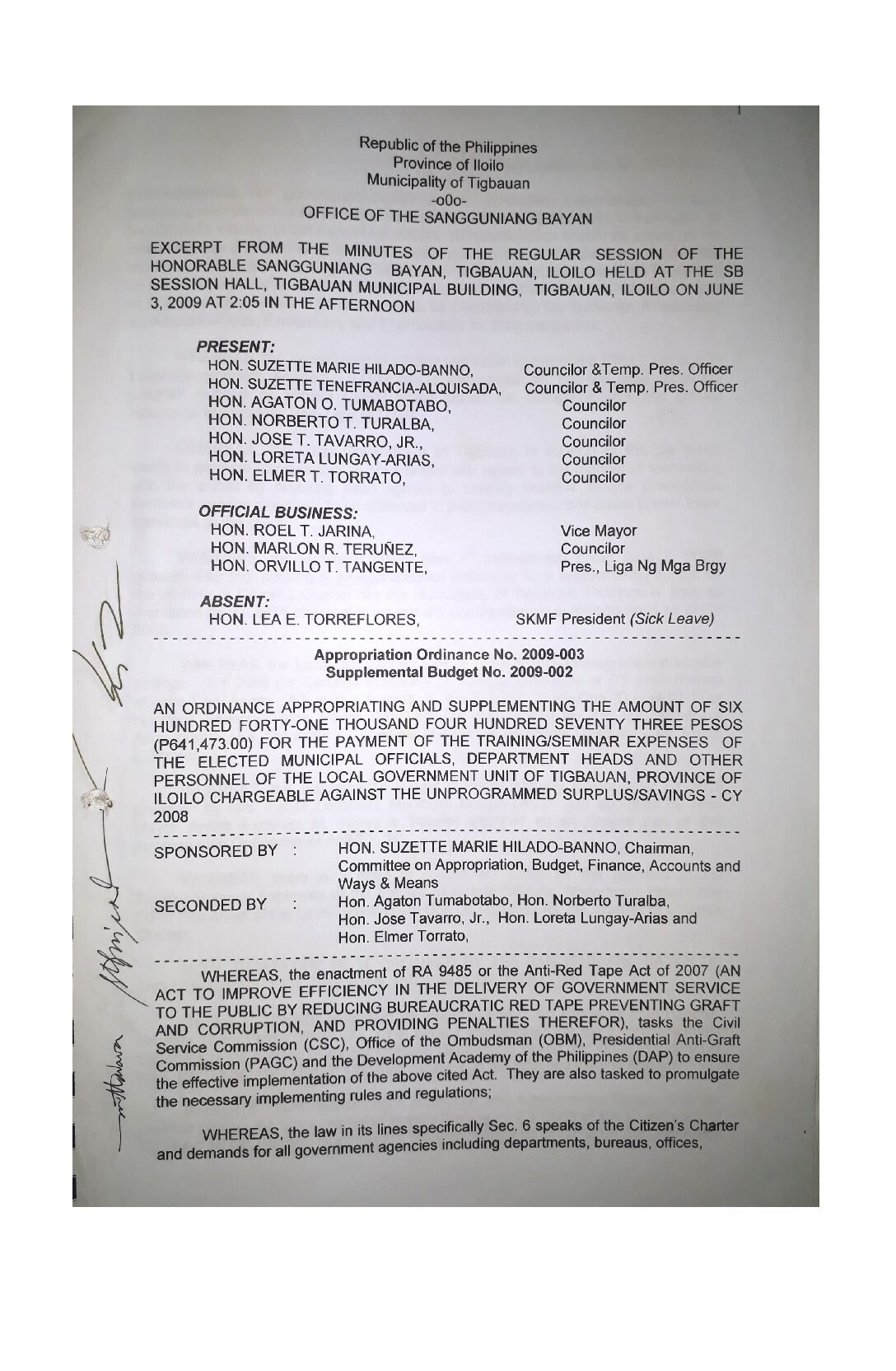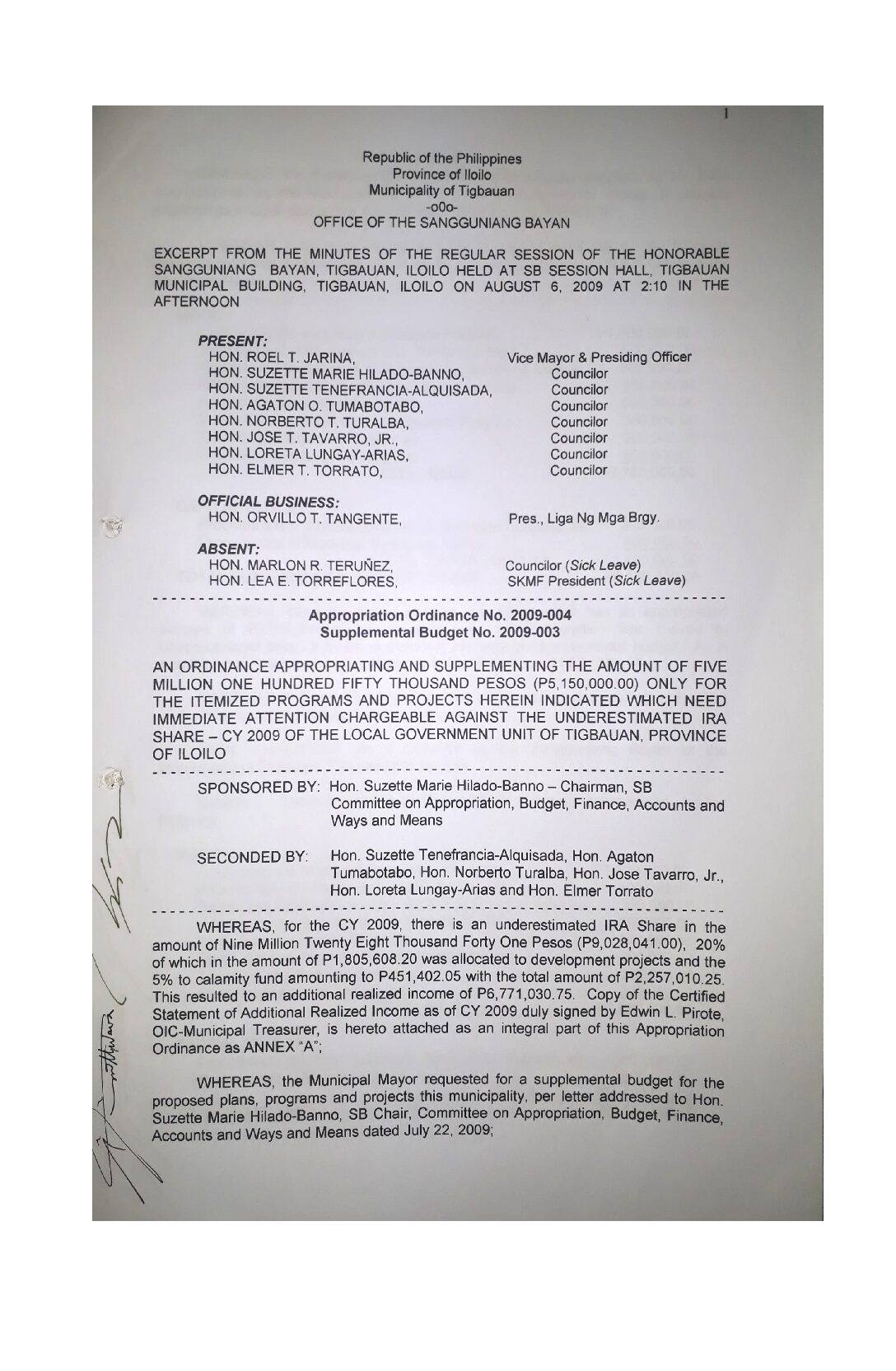Appropriation Ordinance No. 2009-003