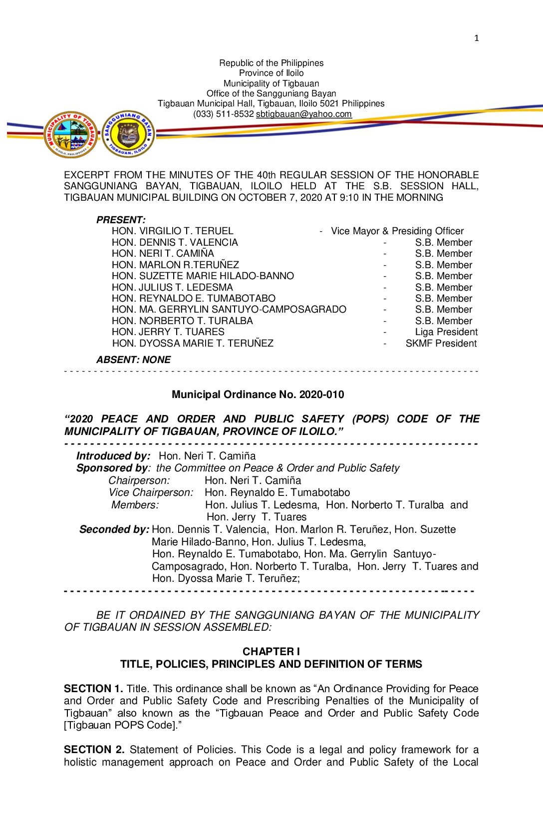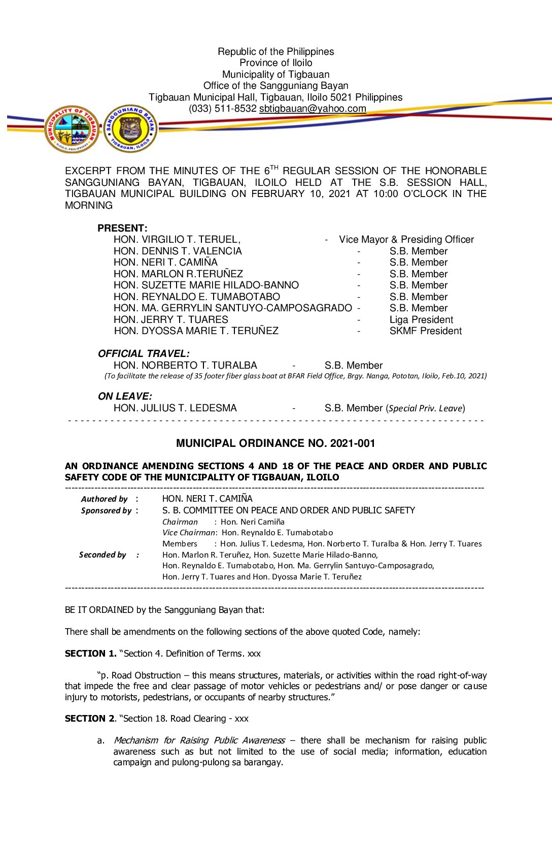 Municipal Ordinance No. 2021-001 – AN ORDINANCE AMENDING SECTIONS 4 AND 18 OF THE PEACE AND ORDER AND PUBLIC SAFETY CODE OF THE MUNICIPALITY OF TIGBAUAN, ILOILO