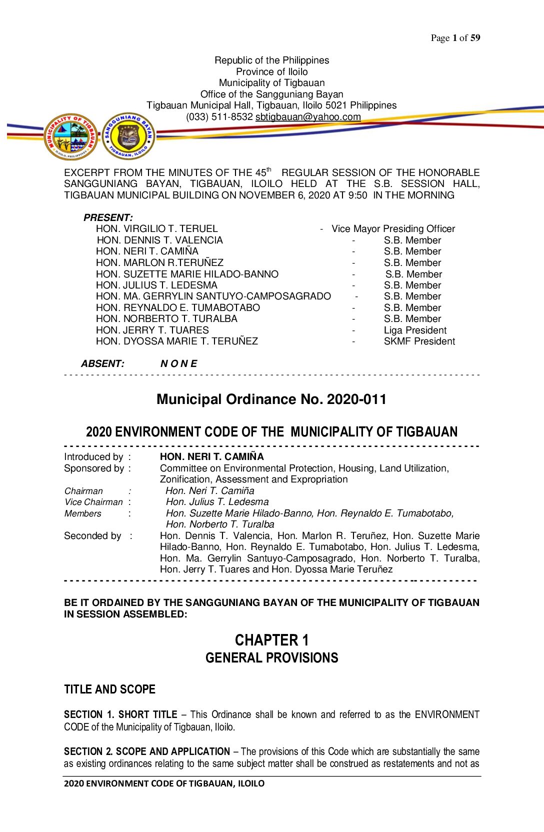 Municipal Ordinance No. 2020-011 – 2020 ENVIRONMENT CODE OF THE MUNICIPALITY OF TIGBAUAN