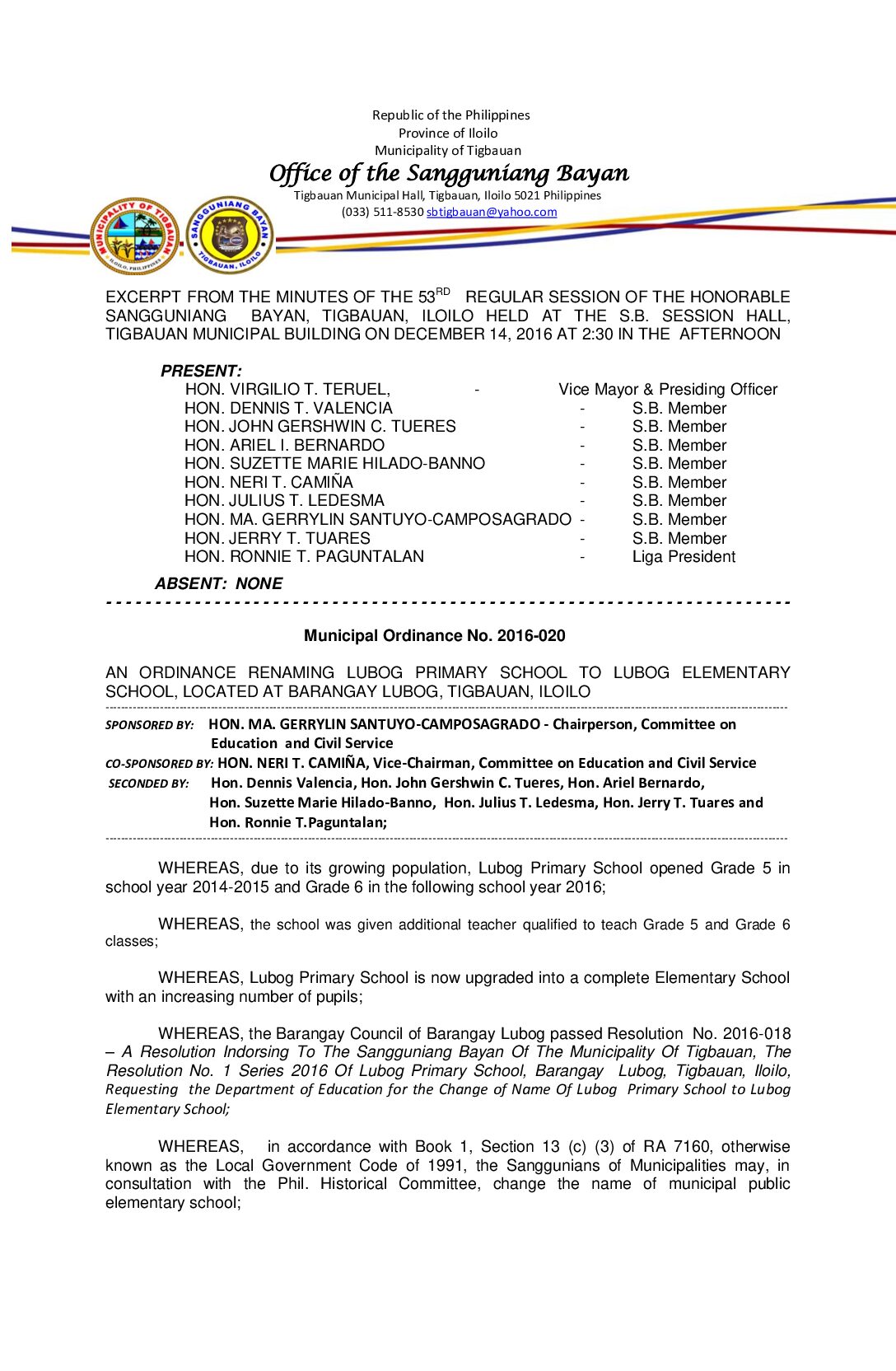 Municipal Ordinance No. 2016-020 – AN ORDINANCE RENAMING LUBOG PRIMARY SCHOOL TO LUBOG ELEMENTARY SCHOOL, LOCATED AT BARANGAY LUBOG, TIGBAUAN, ILOILO