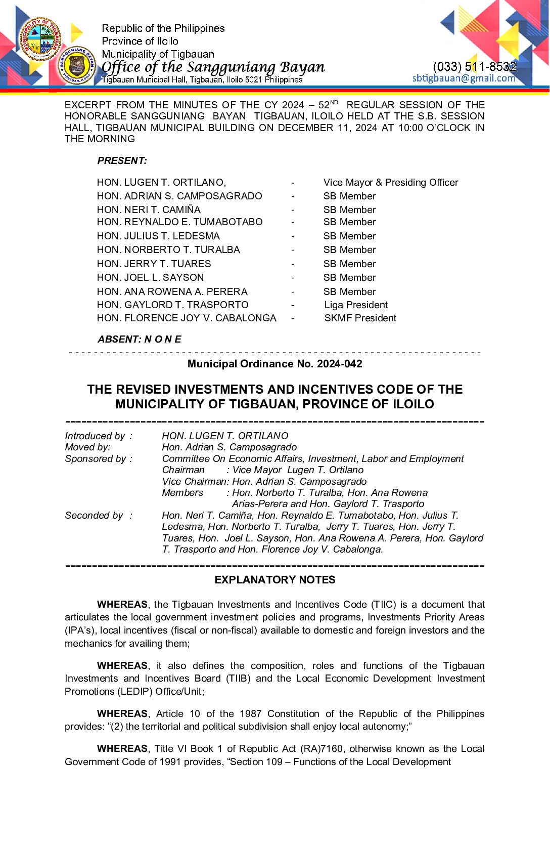Municipal Ordinance No. 2024-042 – THE REVISED INVESTMENTS AND INCENTIVES CODE OF THE MUNICIPALITY OF TIGBAUAN, PROVINCE OF ILOILO
