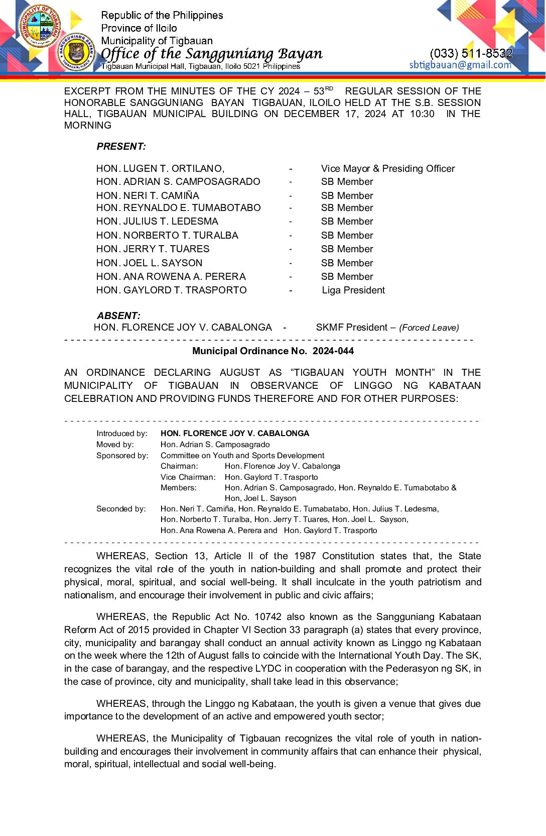 Municipal Ordinance No. 2024-044 – AN ORDINANCE DECLARING AUGUST AS “TIGBAUAN YOUTH MONTH” IN THE MUNICIPALITY OF TIGBAUAN IN OBSERVANCE OF LINGGO NG KABATAAN CELEBRATION AND PROVIDING FUNDS THEREFORE AND FOR OTHER PURPOSES: