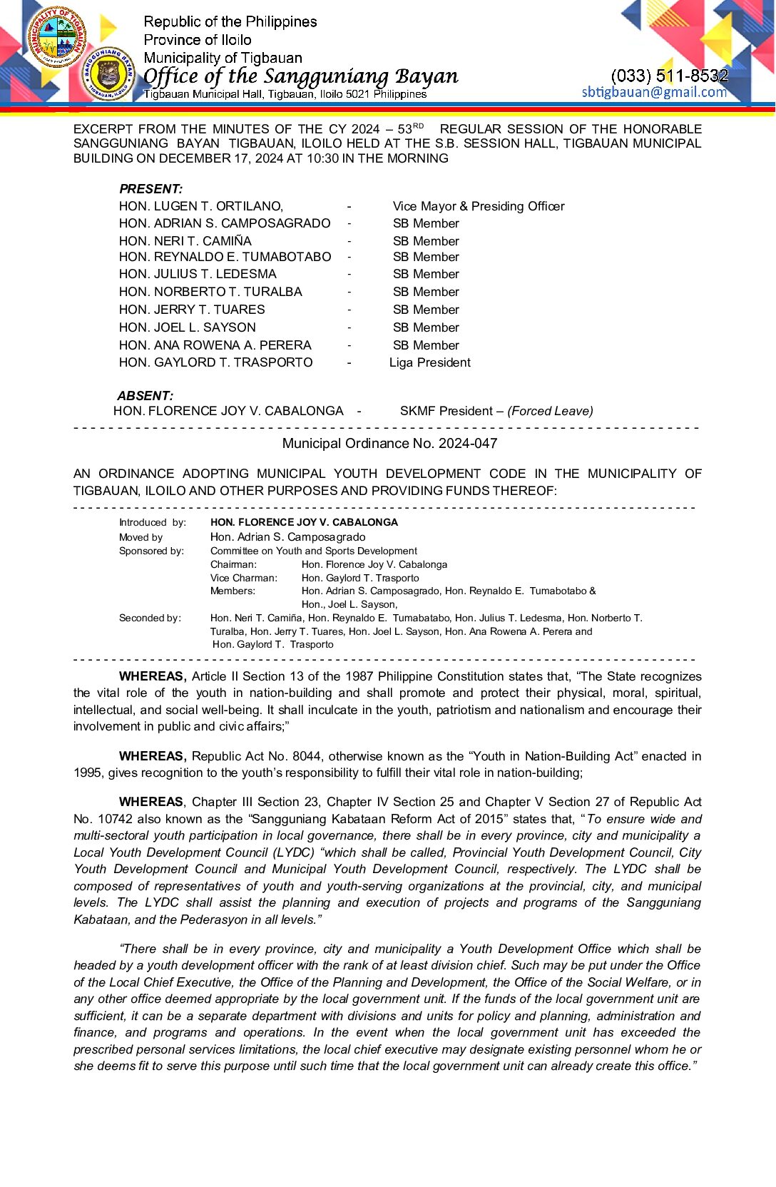 Municipal Ordinance No. 2024-047 – AN ORDINANCE ADOPTING MUNICIPAL YOUTH DEVELOPMENT CODE IN THE MUNICIPALITY OF TIGBAUAN, ILOILO AND OTHER PURPOSES AND PROVIDING FUNDS THEREOF: