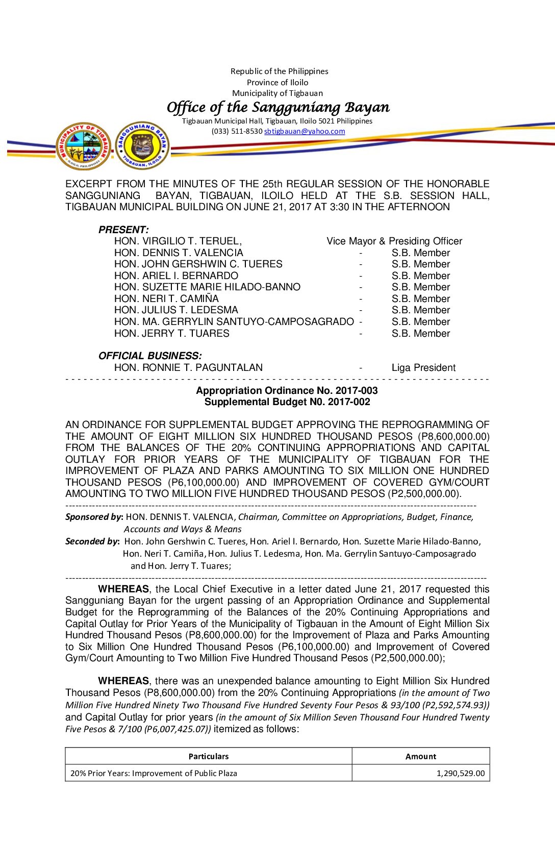 Appropriation Ordinance No. 2017-003 Supplemental Budget N0. 2017-002