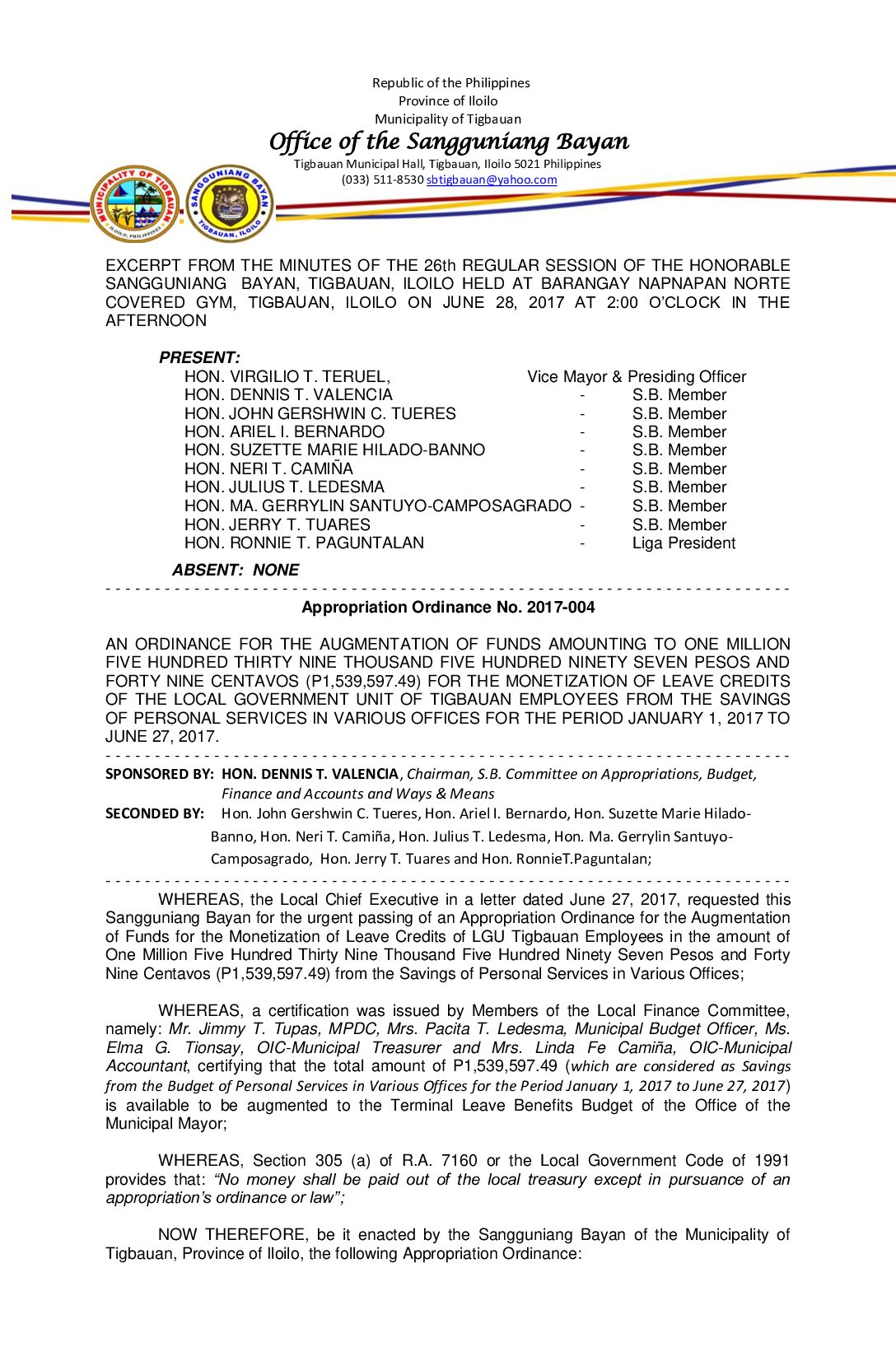 Appropriation Ordinance No. 2017-004