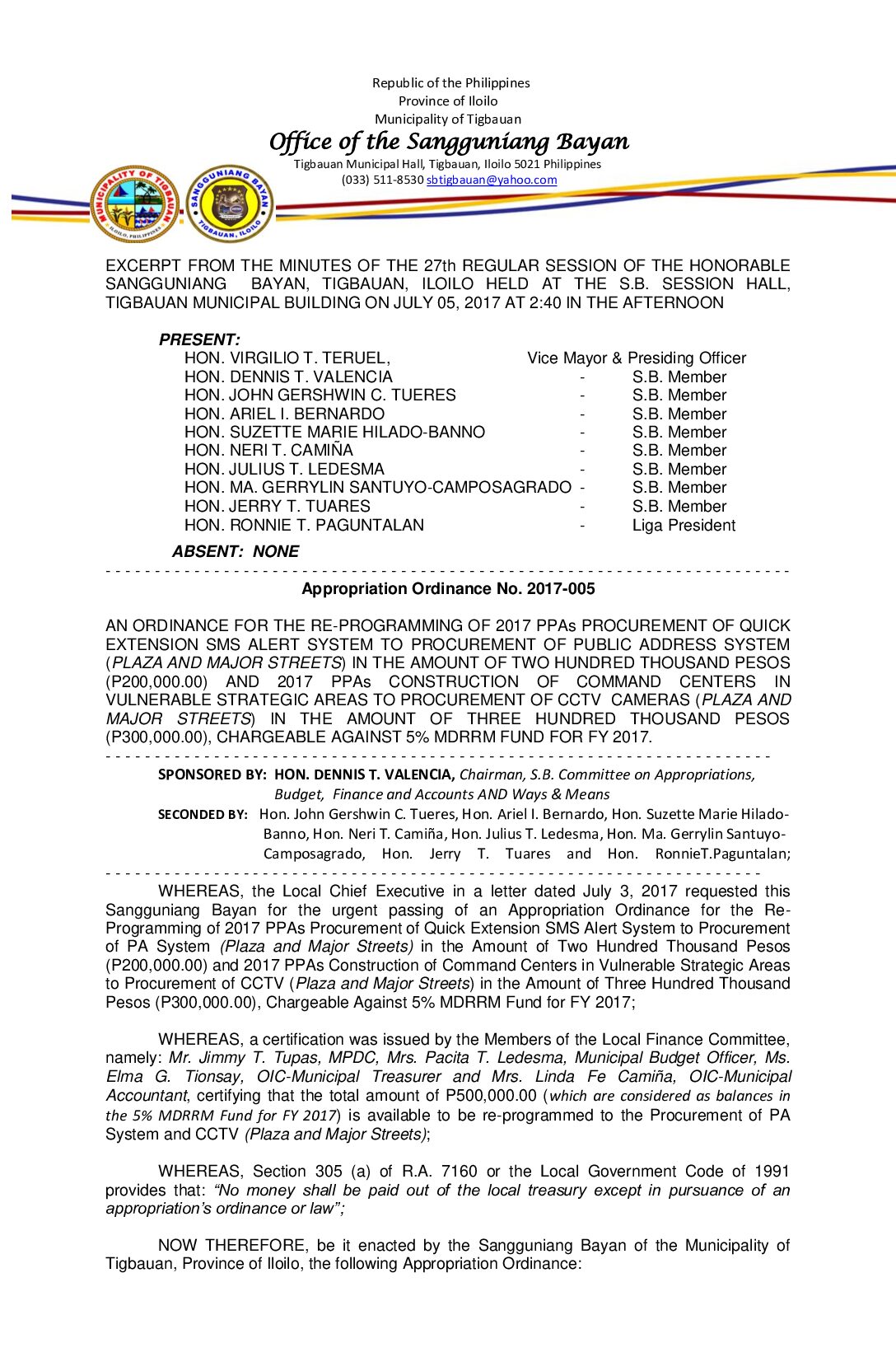 Appropriation Ordinance No. 2017-005