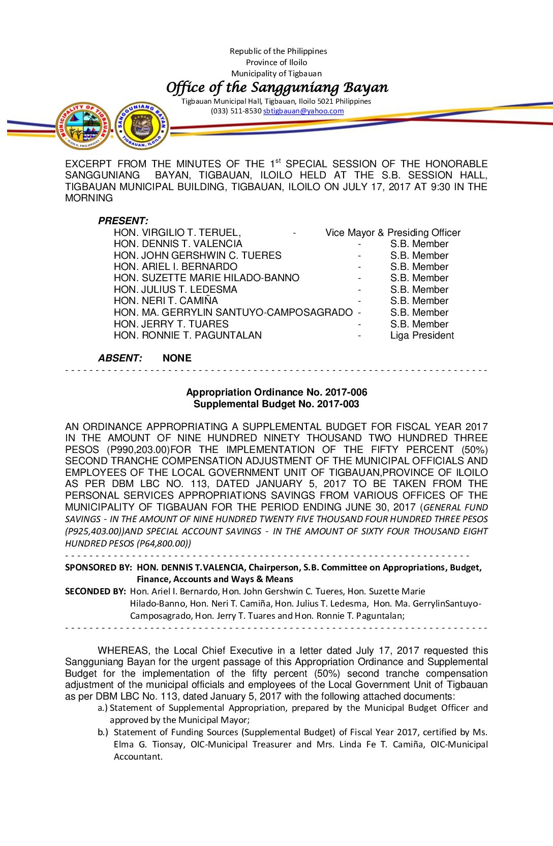 Appropriation Ordinance No. 2017-006 Supplemental Budget No. 2017-003
