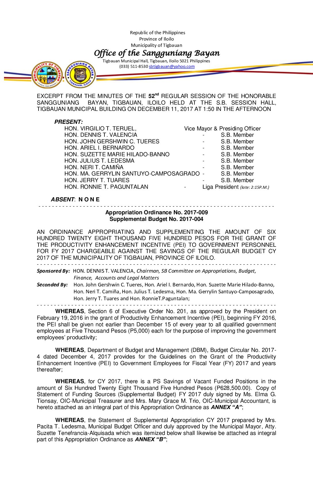 Appropriation Ordinance No. 2017-009 Supplemental Budget No. 2017-004