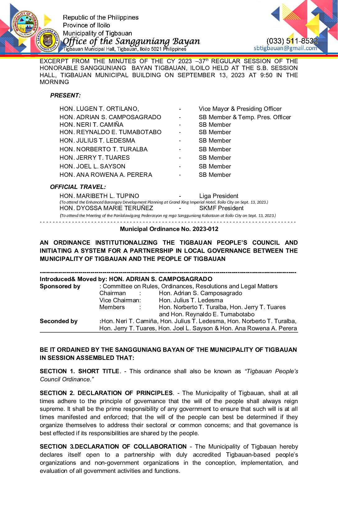 Municipal Ordinance No. 2023-012 -AN ORDINANCE INSTITUTIONALIZING THE TIGBAUAN PEOPLE’S COUNCIL AND INITIATING A SYSTEM FOR A PARTNERSHIP IN LOCAL GOVERNANCE BETWEEN THE MUNICIPALITY OF TIGBAUAN AND THE PEOPLE OF TIGBAUAN