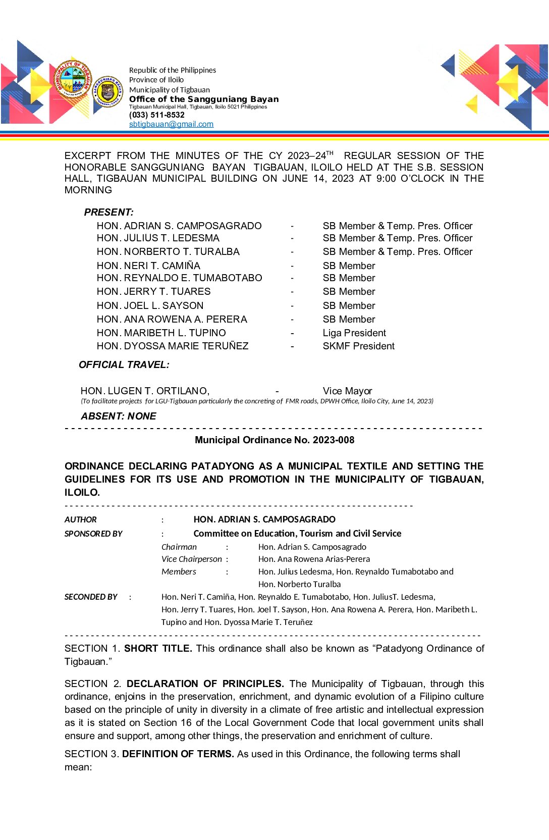 Municipal Ordinance No. 2023-008 – ORDINANCE DECLARING PATADYONG AS A MUNICIPAL TEXTILE AND SETTING THE GUIDELINES FOR ITS USE AND PROMOTION IN THE MUNICIPALITY OF TIGBAUAN, ILOILO.