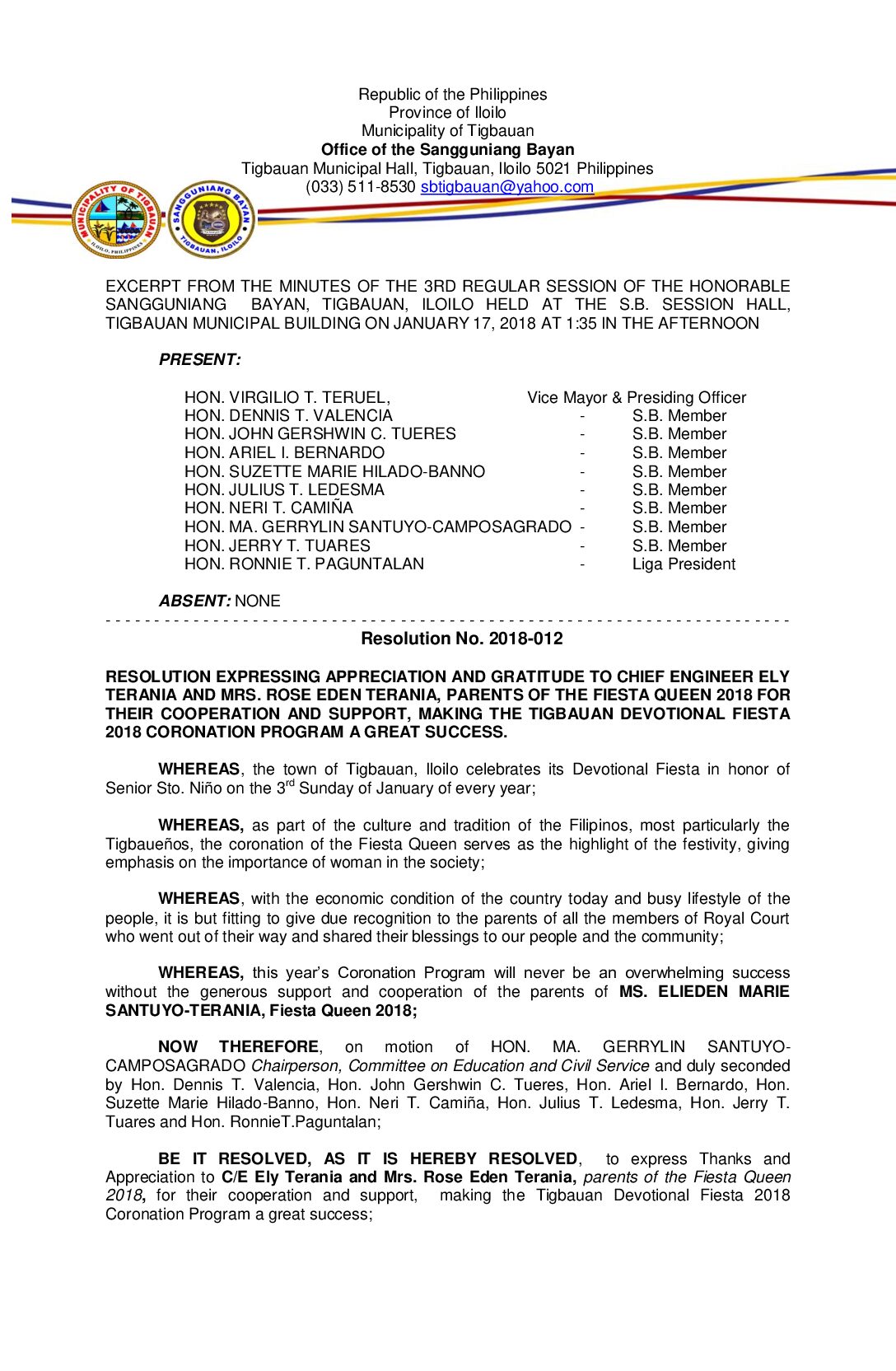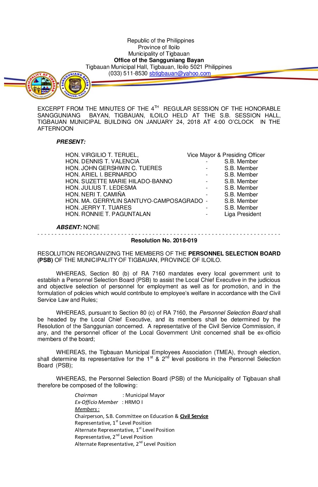 Resolution No. 2018-019 – RESOLUTION REORGANIZING THE MEMBERS OF THE PERSONNEL SELECTION BOARD (PSB) OF THE MUNICIPALITY OF TIGBAUAN, PROVINCE OF ILOILO.