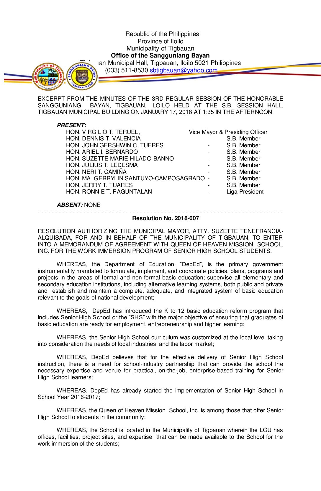 Resolution No. 2018-007 – RESOLUTION AUTHORIZING THE MUNICIPAL MAYOR, ATTY. SUZETTE TENEFRANCIA- ALQUISADA, FOR AND IN BEHALF OF THE MUNICIPALITY OF TIGBAUAN, TO ENTER INTO A MEMORANDUM OF AGREEMENT WITH QUEEN OF HEAVEN MISSION SCHOOL, INC. FOR THE WORK IMMERSION PROGRAM OF SENIOR HIGH SCHOOL STUDENTS.
