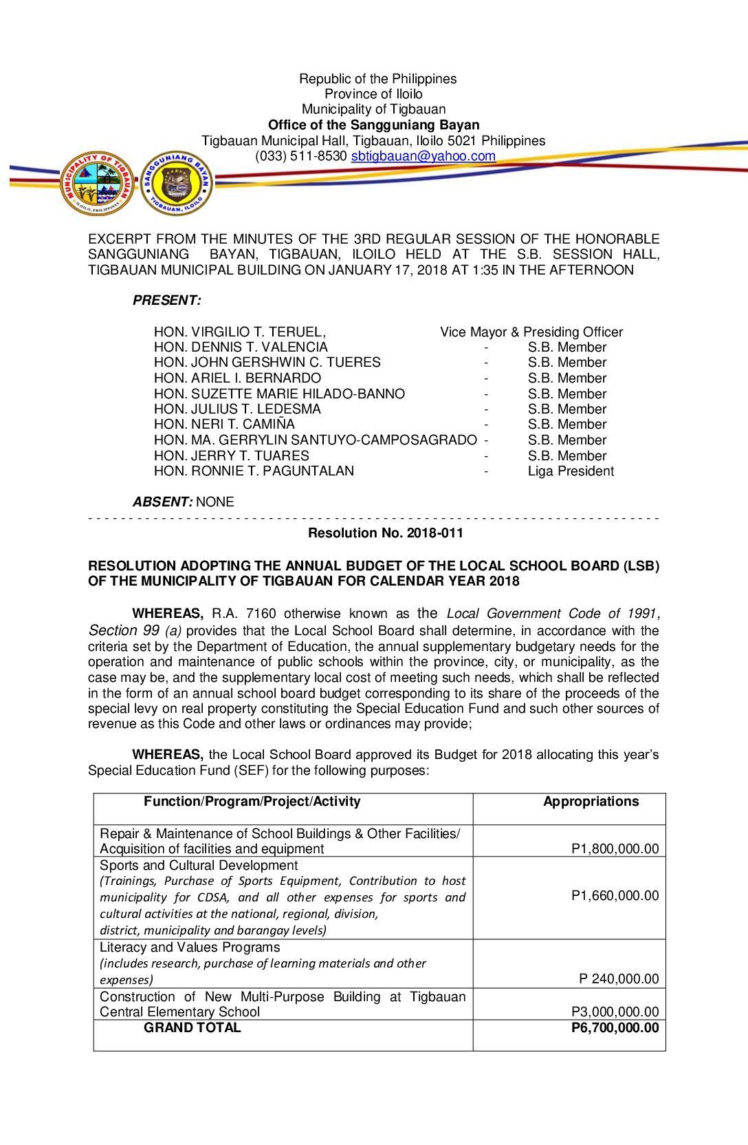 Resolution No. 2018-016 – RESOLUTION EXPRESSING APPRECIATION AND GRATITUDE TO MR. RANIEL AND NENA TAYONGTONG, PARENTS OF PRINCE OF WATER, FOR THEIR COOPERATION AND SUPPORT, MAKING THE TIGBAUAN DEVOTIONAL FIESTA 2018 CORONATION PROGRAM A GREAT SUCCESS.