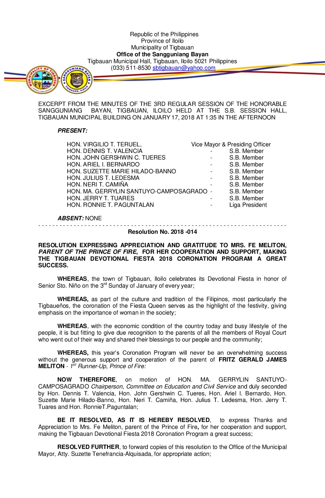 Resolution No. 2018-015 – RESOLUTION EXPRESSING APPRECIATION AND GRATITUDE TO MR. RUDY AND SHERYLE QUINTERO, PARENTS OF 2ND RUNNER UP – PRINCESS OF WATER, FOR THEIR COOPERATION AND SUPPORT, MAKING THE TIGBAUAN DEVOTIONAL FIESTA 2018 CORONATION PROGRAM A GREAT SUCCESS.