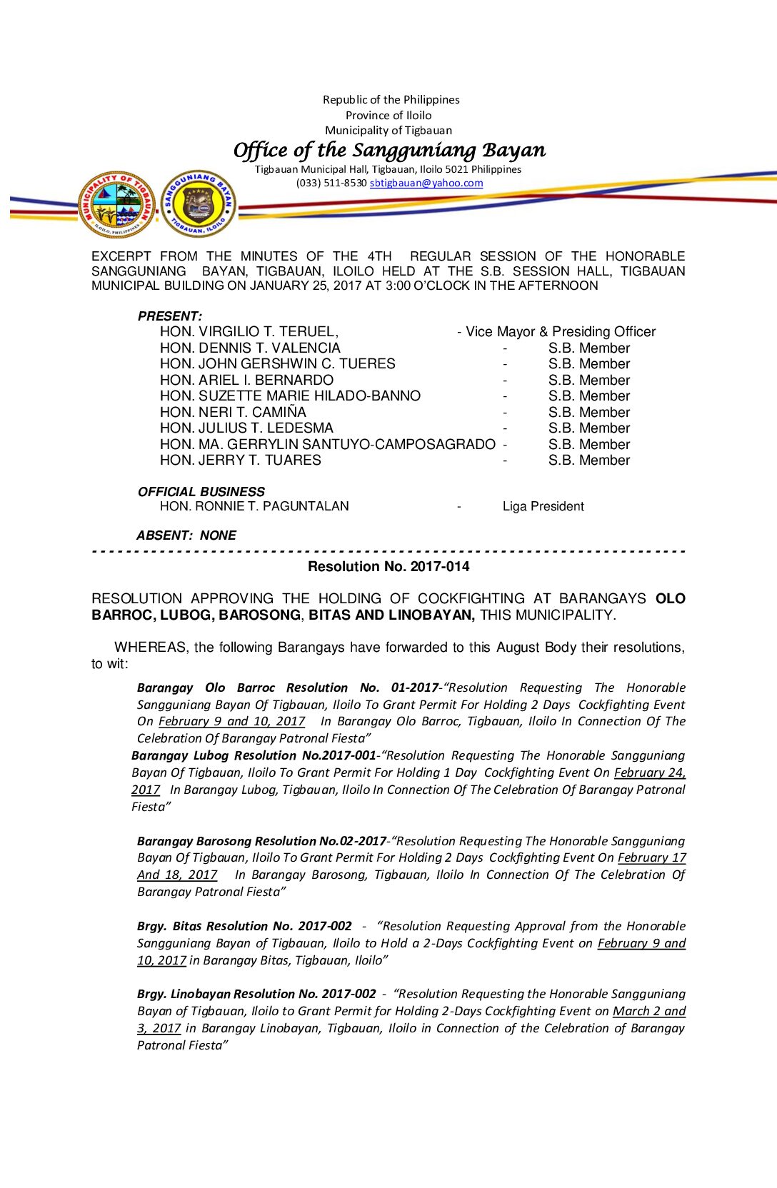 Resolution No. 2017-023 – RESOLUTION APPROVING THE HOLDING OF COCKFIGHTING AT BARANGAYS ISAUAN AND BANTUD, THIS MUNICIPALITY.