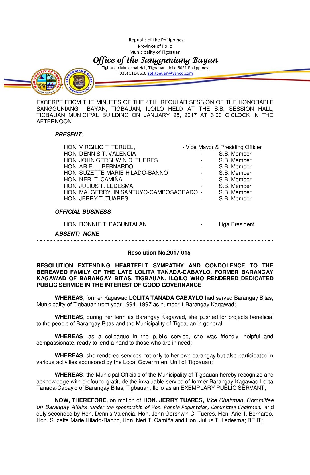 Resolution No. 2017-015 – RESOLUTION EXTENDING HEARTFELT SYMPATHY AND CONDOLENCE TO THE BEREAVED FAMILY OF THE LATE LOLITA TAÑADA-CABAYLO, FORMER BARANGAY KAGAWAD OF BARANGAY BITAS, TIGBAUAN, ILOILO WHO RENDERED DEDICATED PUBLIC SERVICE IN THE INTEREST OF GOOD GOVERNANCE