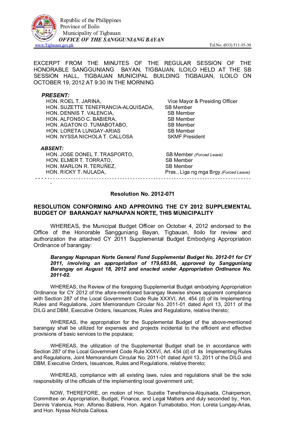 Resolution No. 2012-071 – RESOLUTION CONFORMING AND APPROVING THE CY 2012 SUPPLEMENTAL BUDGET OF BARANGAY NAPNAPAN NORTE, THIS MUNICIPALITY