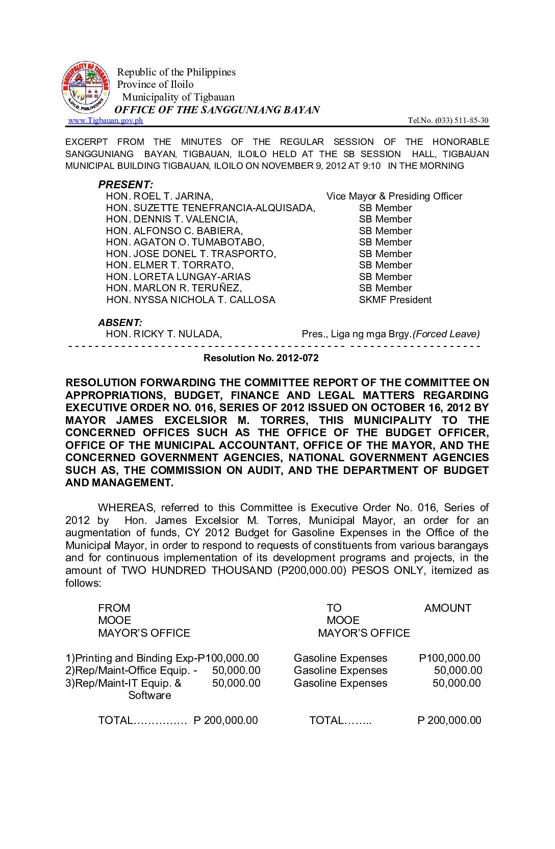 Resolution No. 2012-072 – RESOLUTION FORWARDING THE COMMITTEE REPORT OF THE COMMITTEE ON APPROPRIATIONS, BUDGET, FINANCE AND LEGAL MATTERS REGARDING EXECUTIVE ORDER NO. 016, SERIES OF 2012 ISSUED ON OCTOBER 16, 2012 BY MAYOR JAMES EXCELSIOR M. TORRES, THIS MUNICIPALITY TO THE CONCERNED OFFICES SUCH AS THE OFFICE OF THE BUDGET OFFICER, OFFICE OF THE MUNICIPAL ACCOUNTANT, OFFICE OF THE MAYOR, AND THE CONCERNED GOVERNMENT AGENCIES, NATIONAL GOVERNMENT AGENCIES SUCH AS, THE COMMISSION ON AUDIT, AND THE DEPARTMENT OF BUDGET AND MANAGEMENT.