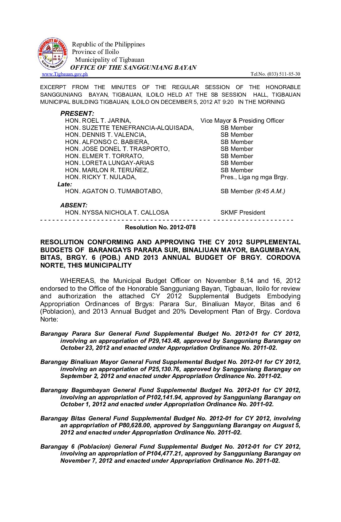 Resolution No. 2012-078 – RESOLUTION CONFORMING AND APPROVING THE CY 2012 SUPPLEMENTAL BUDGETS OF BARANGAYS PARARA SUR, BINALIUAN MAYOR, BAGUMBAYAN, BITAS, BRGY. 6 (POB.) AND 2013 ANNUAL BUDGET OF BRGY. CORDOVA NORTE, THIS MUNICIPALITY