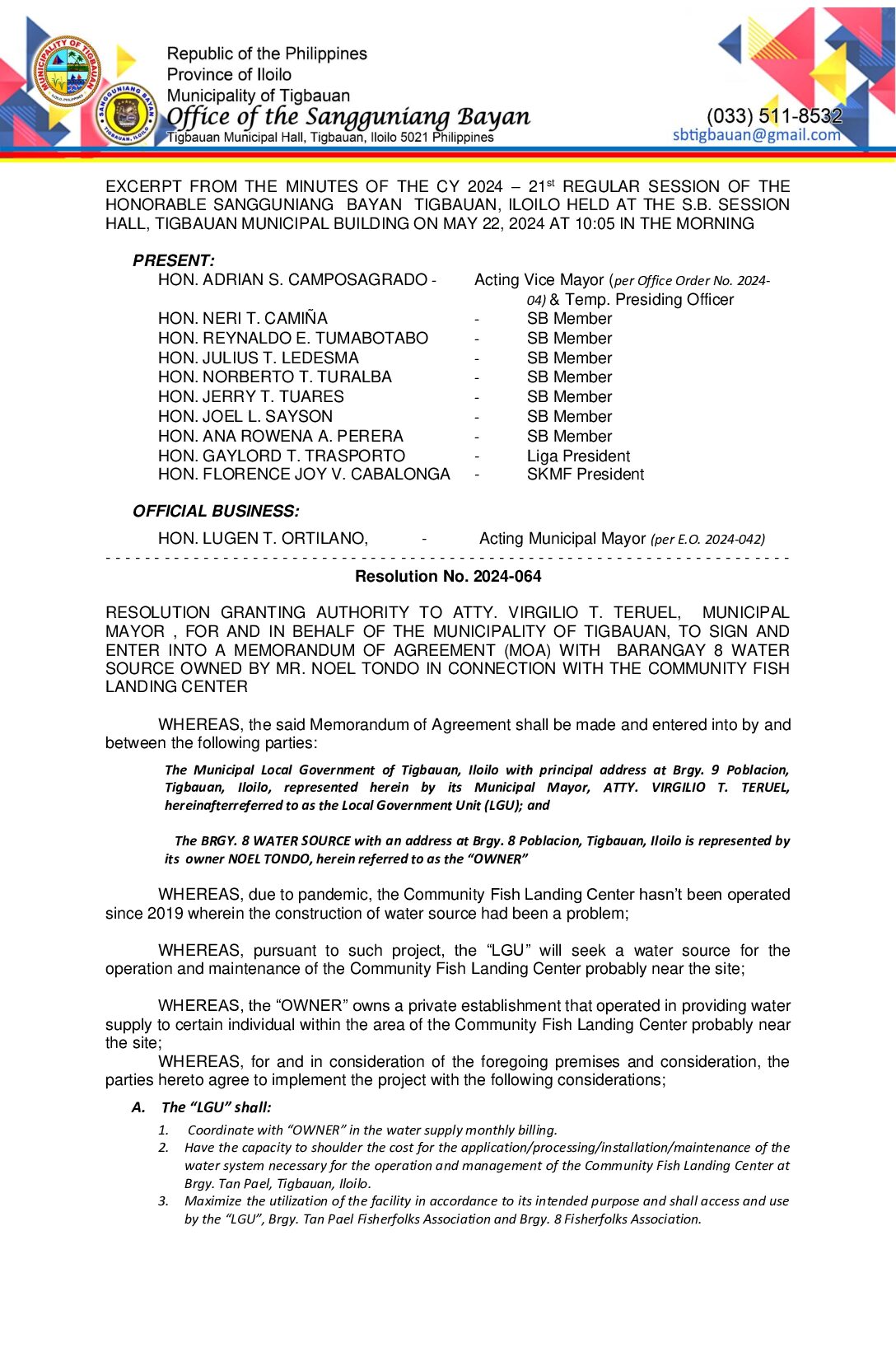 Resolution No. 2024-064 – RESOLUTION GRANTING AUTHORITY TO ATTY. VIRGILIO T. TERUEL, MUNICIPAL MAYOR, FOR AND IN BEHALF OF THE MUNICIPLAITY OF TIGBAUAN, TO SIGN AND ENTER INTO A MEMORANDUM AGREEMENT (MOA) WITH MR. NOEL TONDO, OWNER OF THE WATER SOURCE LOCATED AT BARANGAY 8 POBLACION, IN CONNECTION WITH THE OPERATION OF THE FISH LANDING CENTER