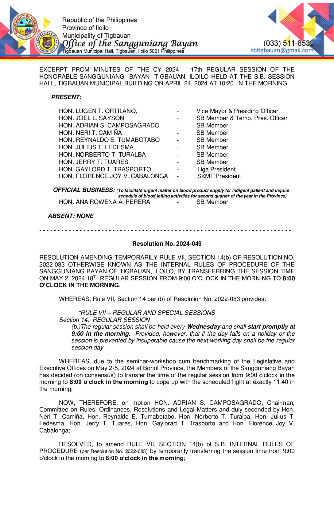 Resolution No. 2024-049 – RESOLUTION AMENDING TEMPORARILY RULE VII, SECTION 14(b) OF RESOLUTION NO. 2022-083 OTHERWISE KNOWN AS THE INTERNAL RULES OF PROCEDURE OF THE SANGGUNIANG BAYAN OF TIGBAUAN, ILOILO, BY TRANSFERRING THE SESSION TIME ON MAY 2, 2024 18TH REGULAR SESSION FROM 9:00 O’CLOCK IN THE MORNING TO 8:00 O’CLOCK IN THE MORNING.