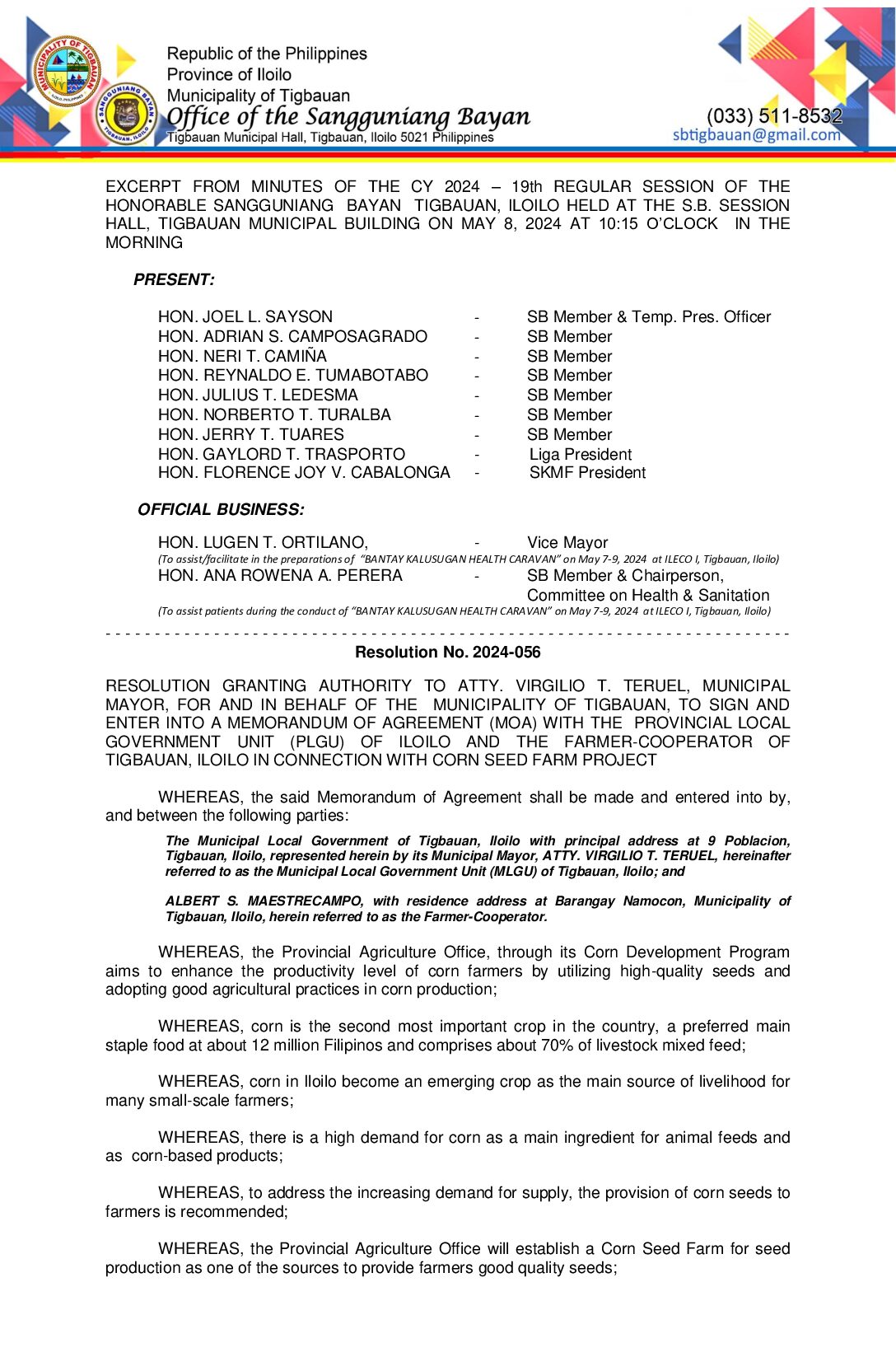 Resolution No. 2024-056 – RESOLUTION GRANTING AUTHORITY TO ATTY. VIRGILIO T. TERUEL, MUNICIPAL MAYOR, FOR AND IN BEHALF OF THE MUNICIPALITY OF TIGBAUAN, TO SIGN AND ENTER INTO A MEMORANDUM AGREEMENT (MOA) WITH THE PROVINCIAL LOCAL GOVERN MENT UNIT (PLGU) OF ILOILO AND THE FARMER-COOPERATOR OF TIGBAUAN, ILOILO IN CONNECTION WITH CORN SEED FARM PROJECT