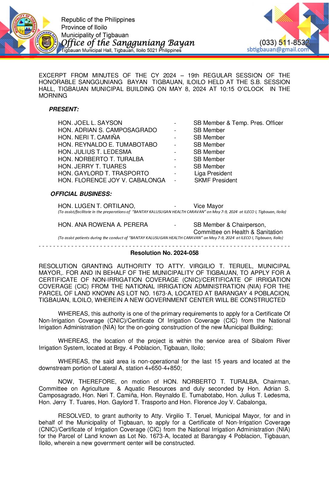 Resolution No. 2024-058 – RESOLUTION GRANTING AUTHORITY TO ATTY. VIRGILIO T. TERUEL, MUNICIPAL MAYOR, FOR AND IN BEHALF OF THE MUNICIPLAITY OF TIGBAUAN, TO APPLY FOR A CERTIFICATE OF NON-IRRIGATION COVERAGE (CNIC)/CERTIFICATE OF IRRIGATION COVERAGE (CIC) FROM THE NATIONAL IRRIGATION ADMINICTRATION (NIA) FOR THE PARCELOF LAND KNOWN AS LOT NO. 1673-A, LOCATED AT BARANGAY 4 POBACION, TIGBAUAN, ILOILO, WHEREIN A NEW GOVERNMENT CENTER WILL BE CONSTRUCTED