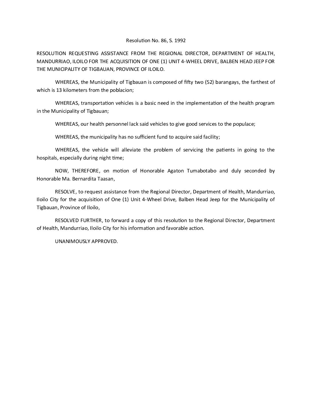Resolution No. 92-086