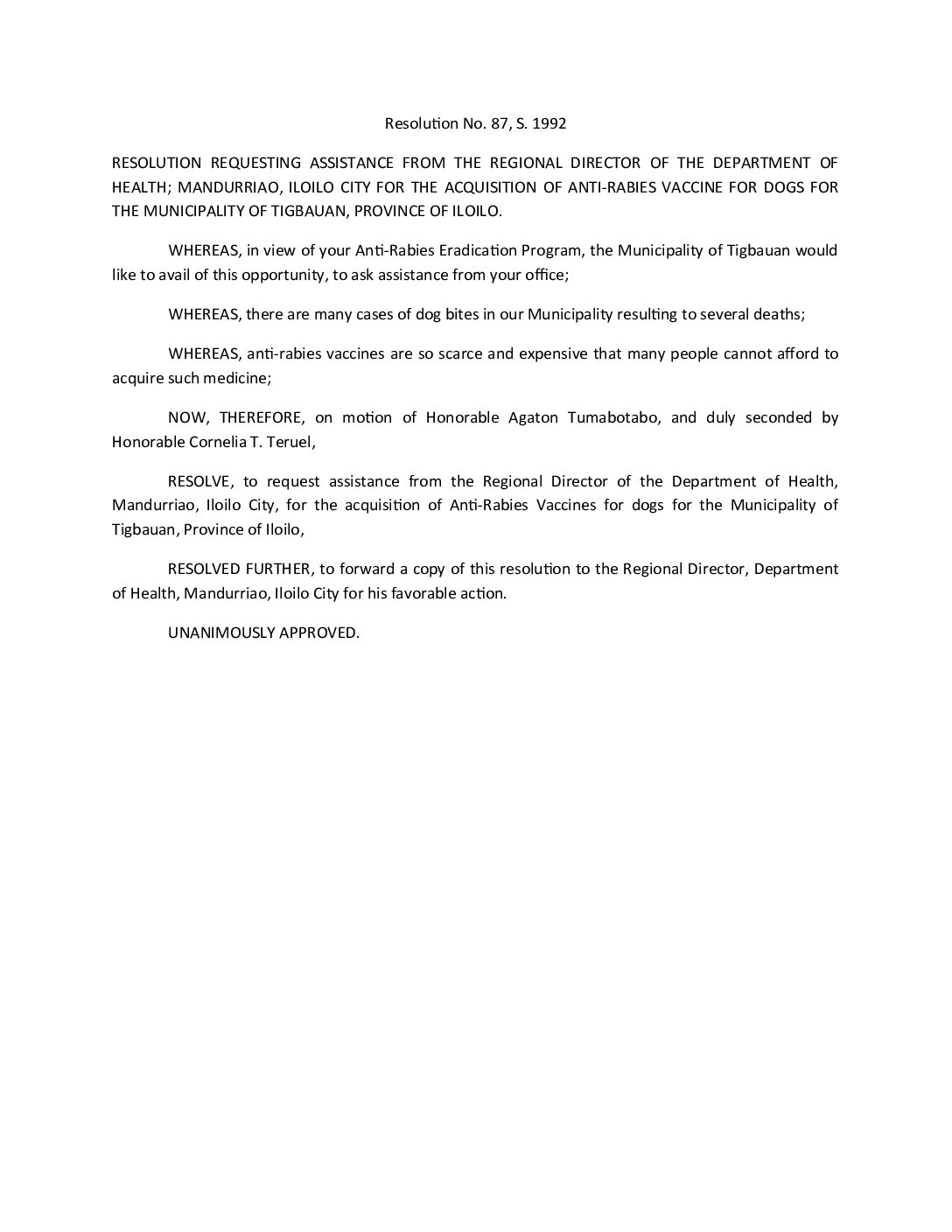 Resolution No. 92-087