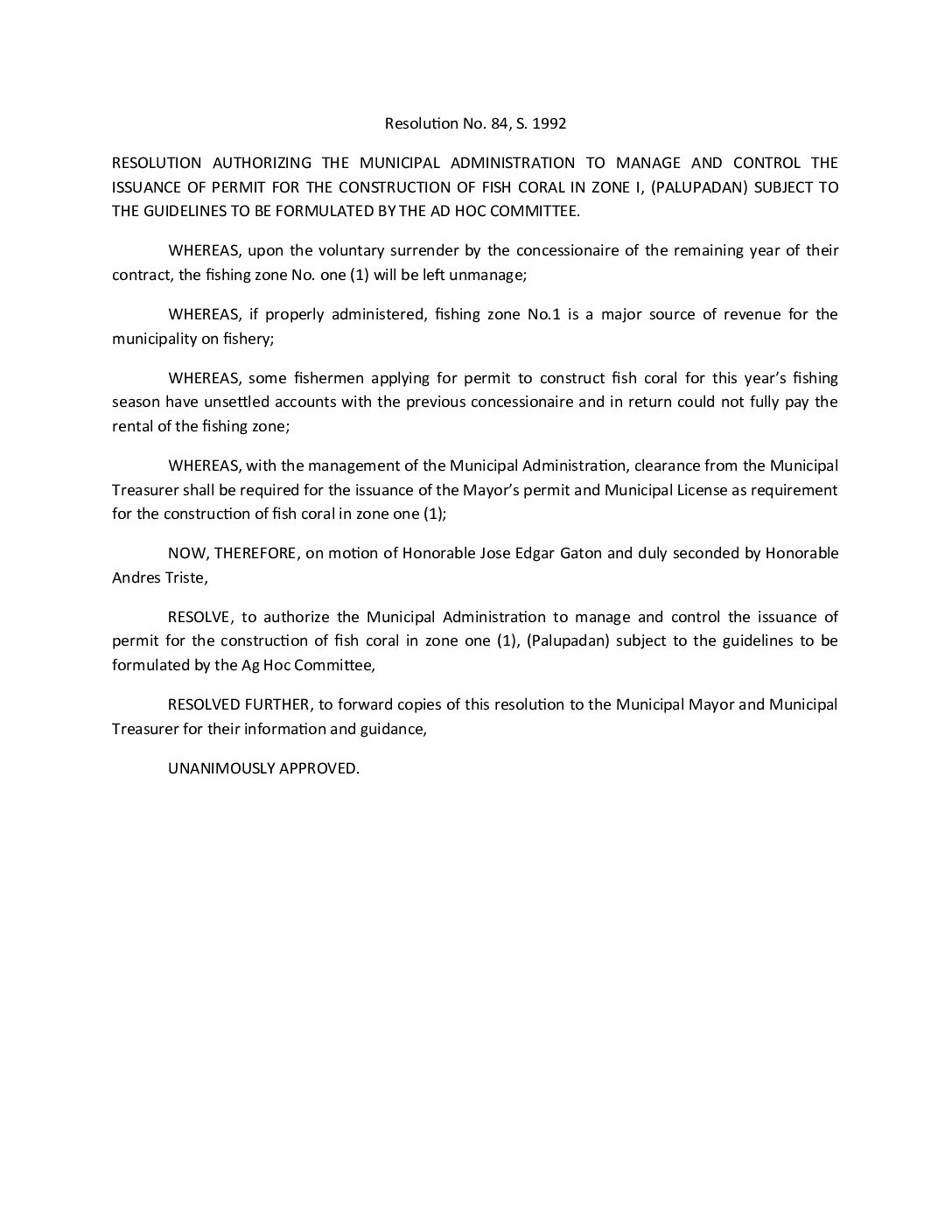 Resolution No. 92-084