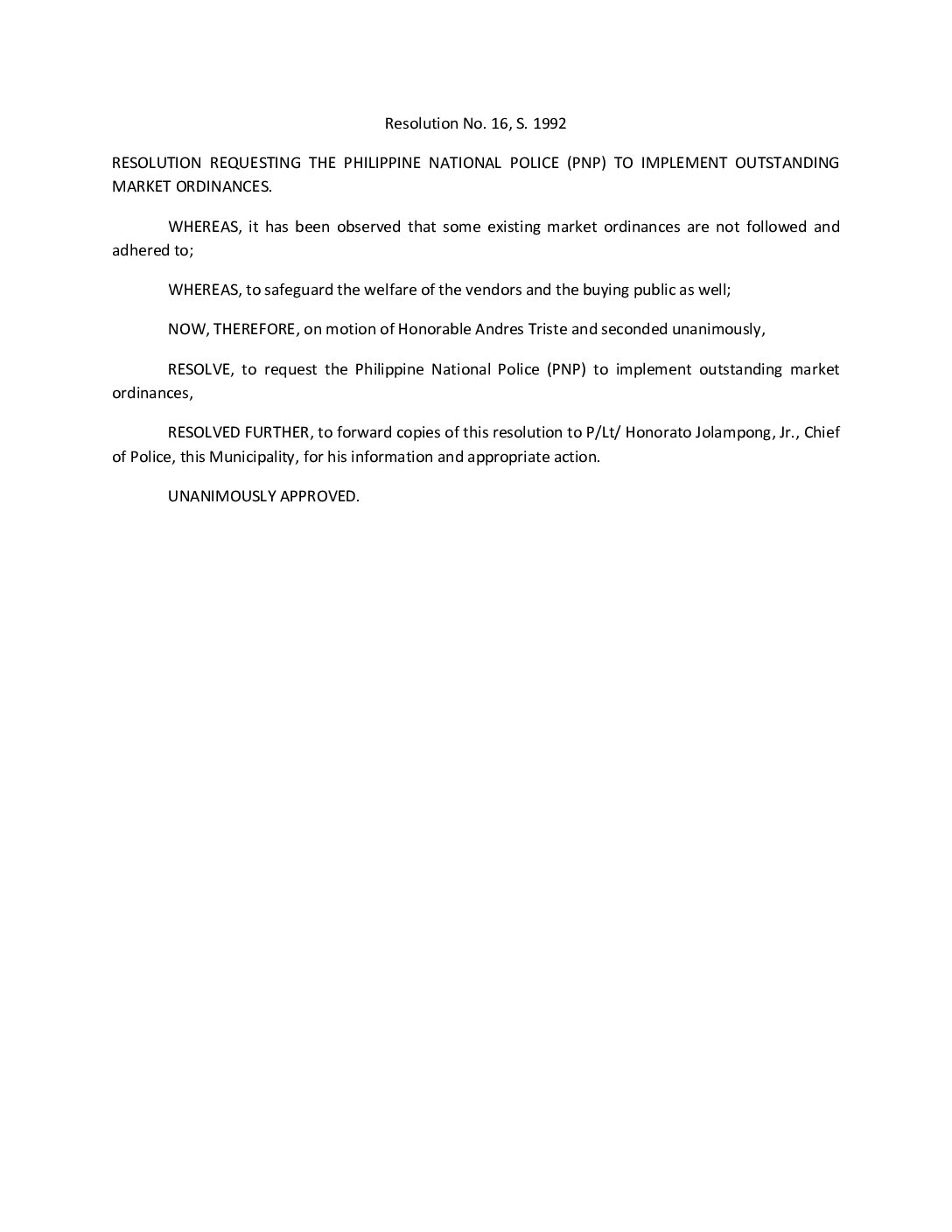 Resolution No. 92-016