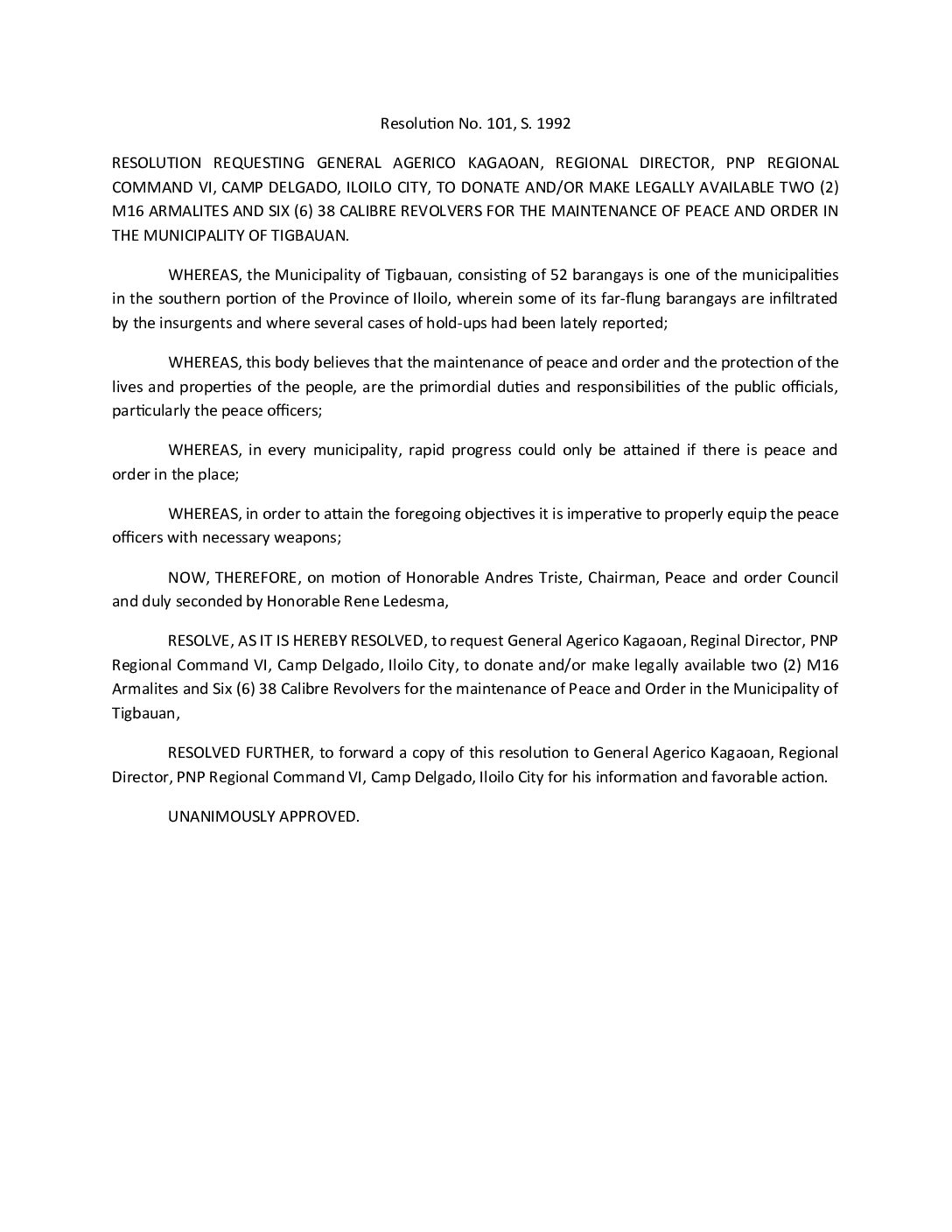 Resolution No. 92-101A