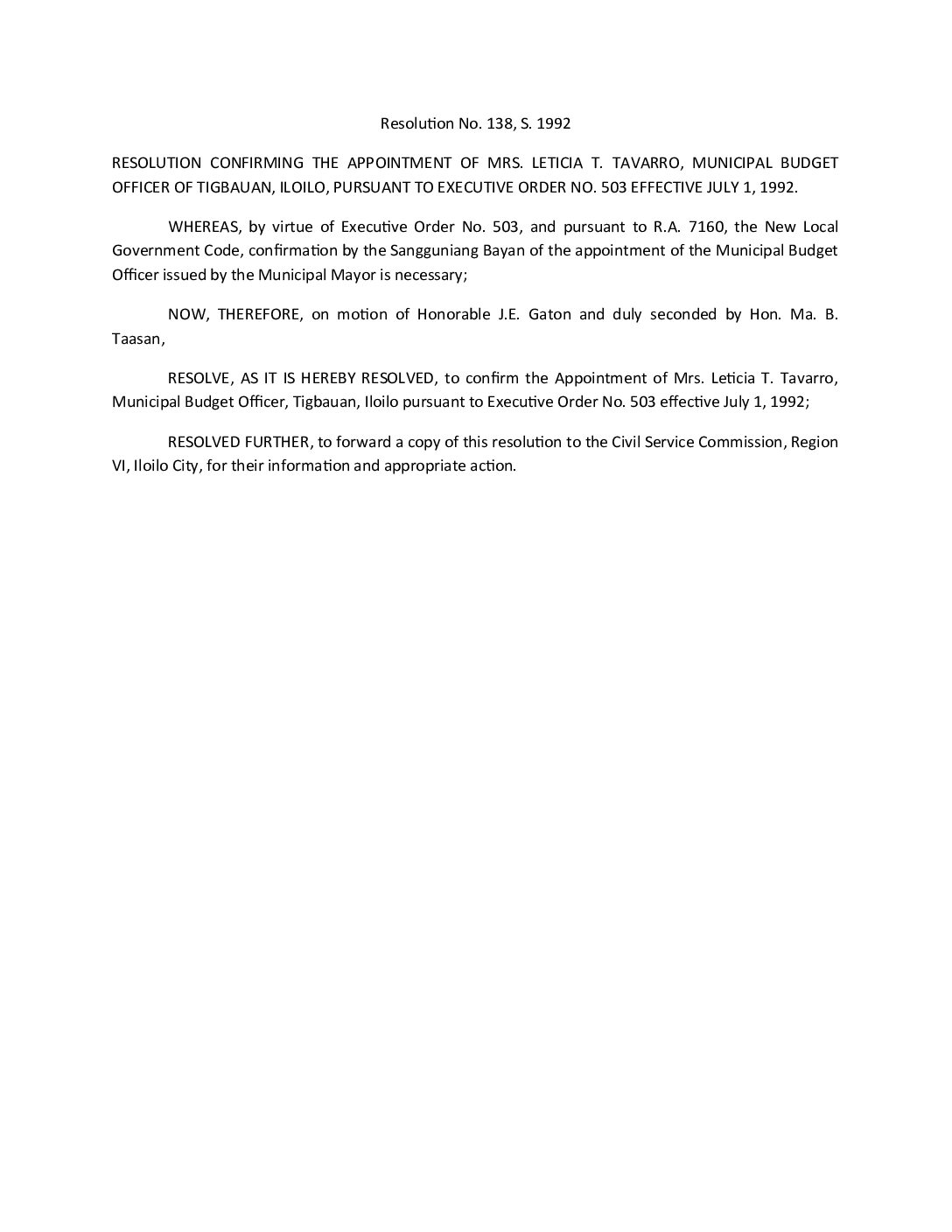 Resolution No. 92-138