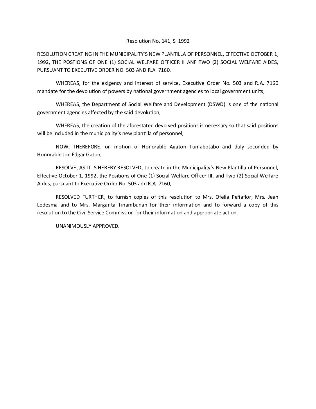 Resolution No. 92-141