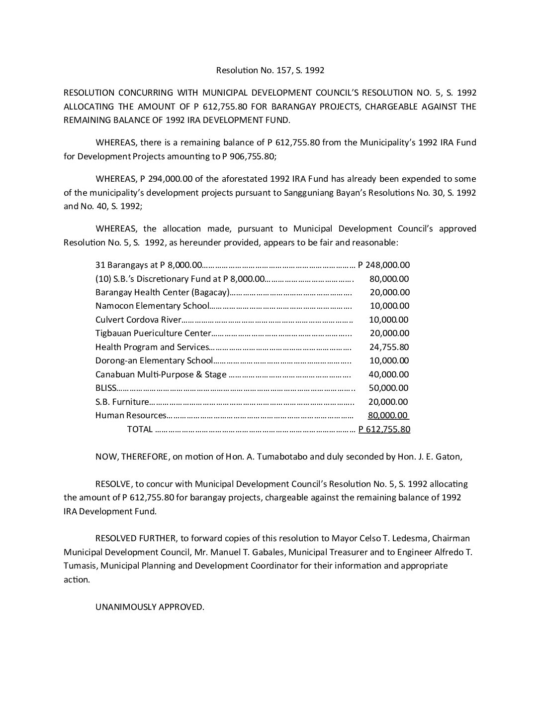 Resolution No. 92-157